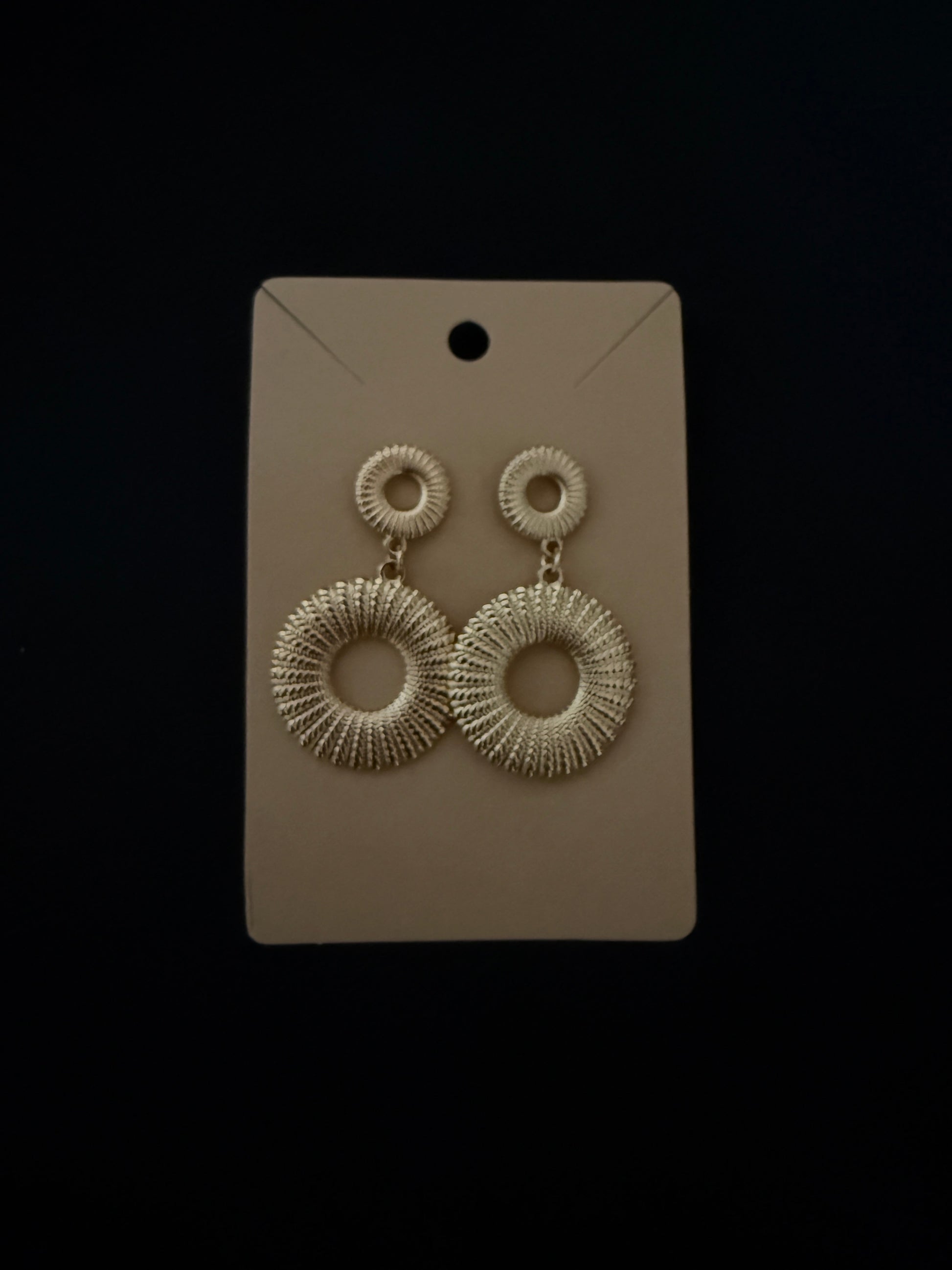 Textured gold disc earrings with a lightweight feel and retro finish. Layered circle design. Easy statement maker.